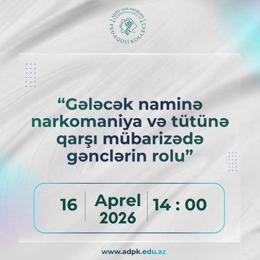 16 aprel 2026-cı il tarixində saat 14:00-da Gənc Vətənpərvərlər İctimai Birliyi və ADPU-nun nəzdində Azərbaycan Dövlət Pedaqoji kollecinin Sabunçu korpusunda “Gələcək naminə narkomaniya və tütünə qarşı mübarizədə gənclərin rolu” mövzusunda tədbir keçiriləcəkdir.