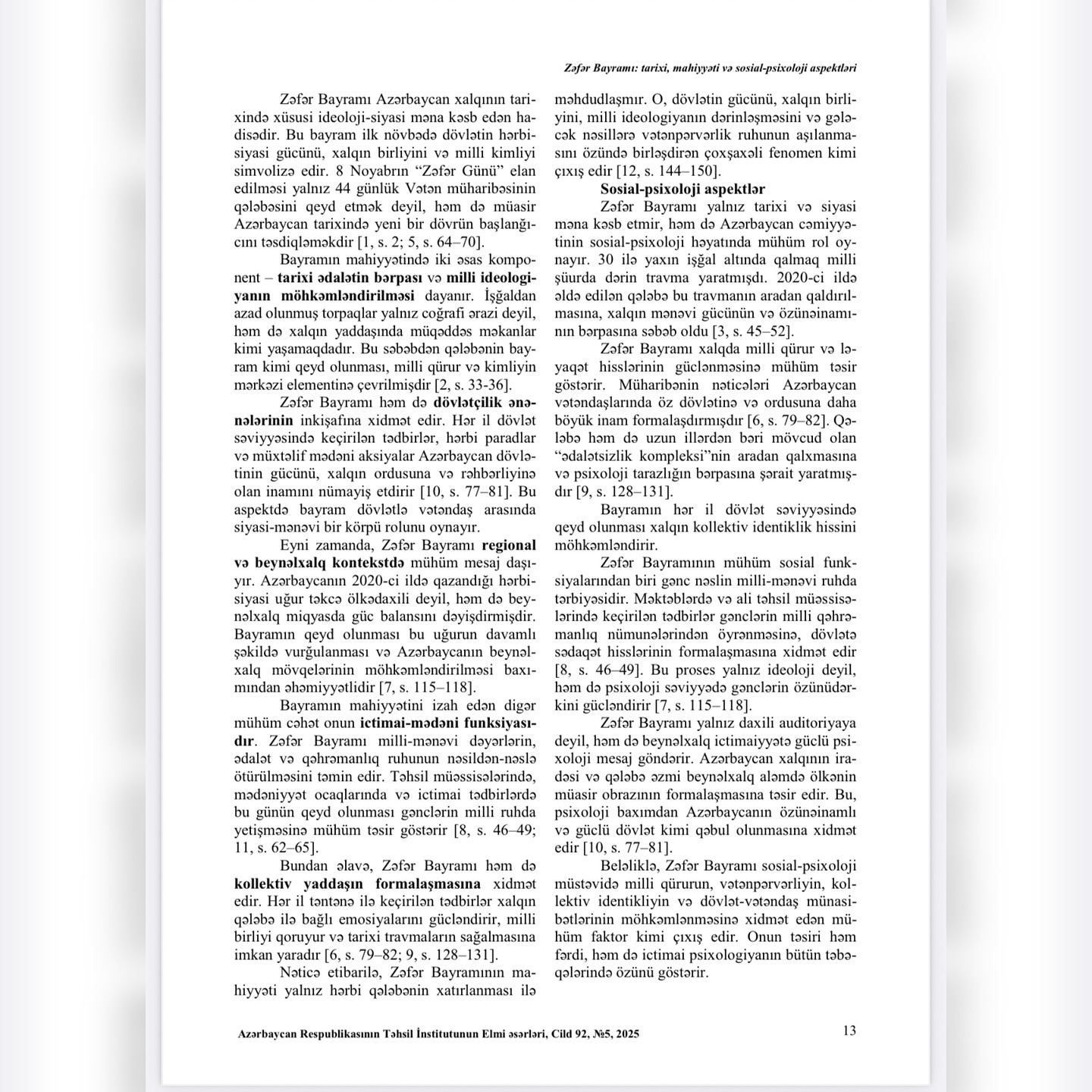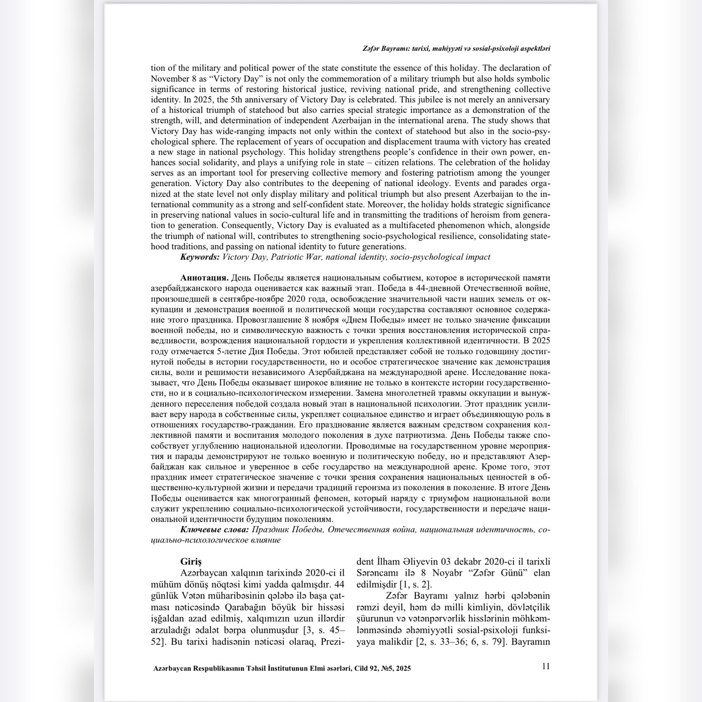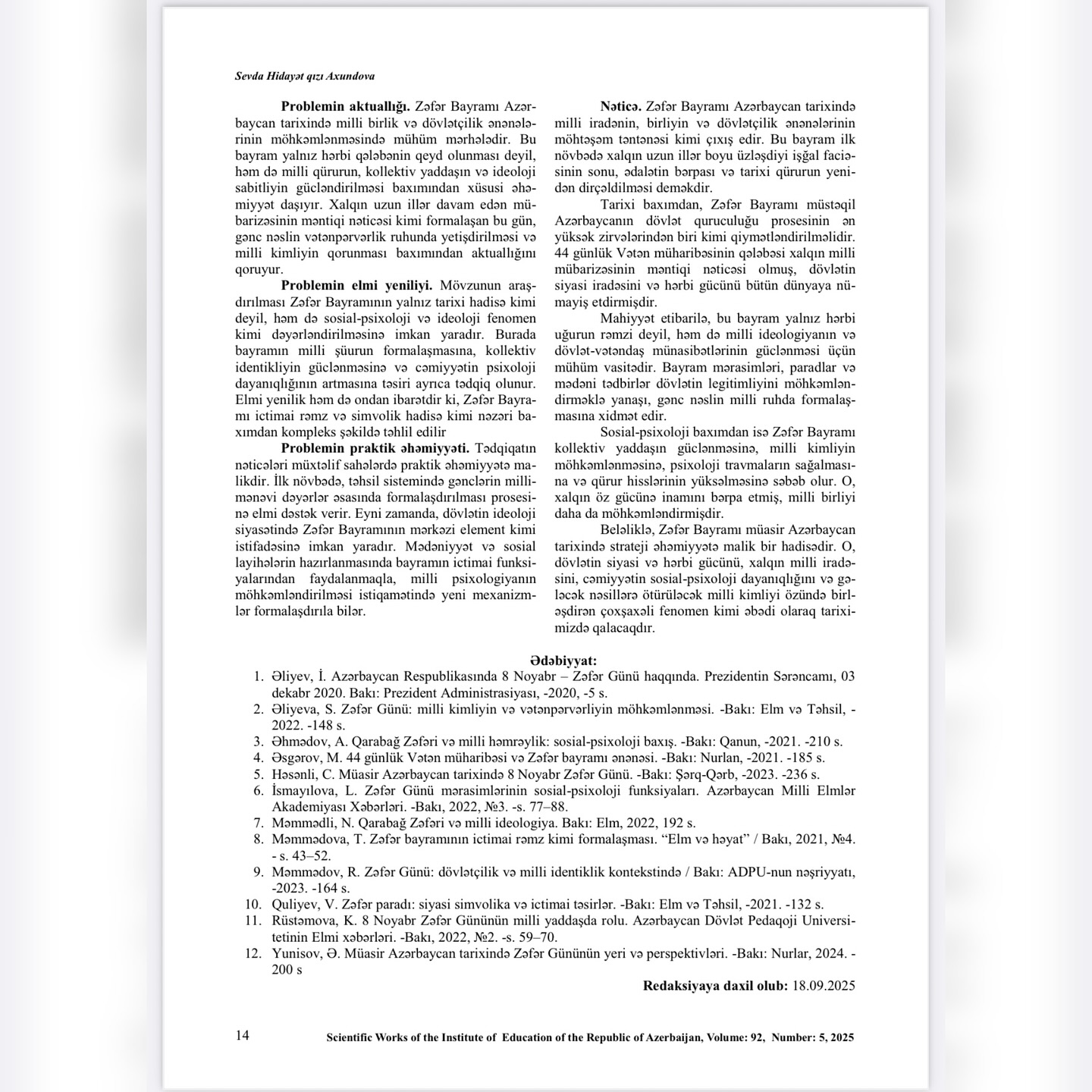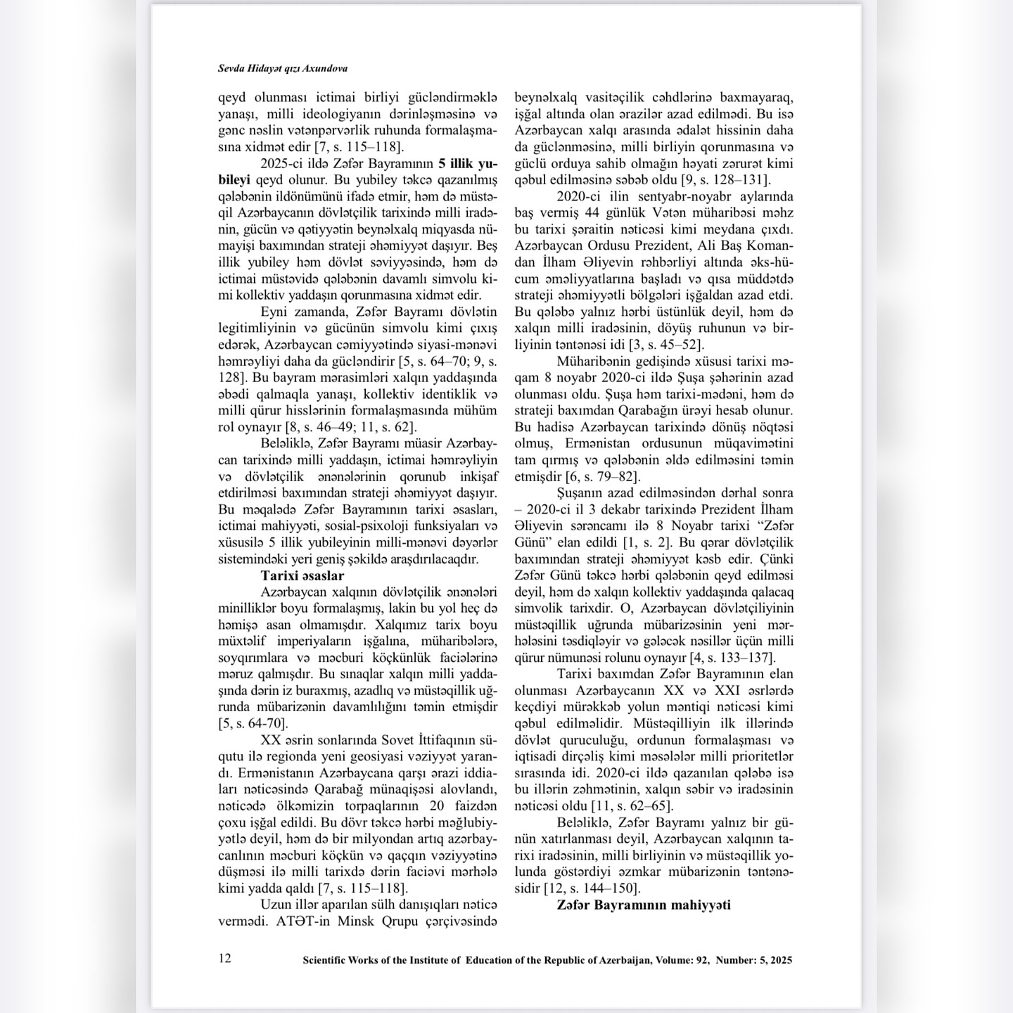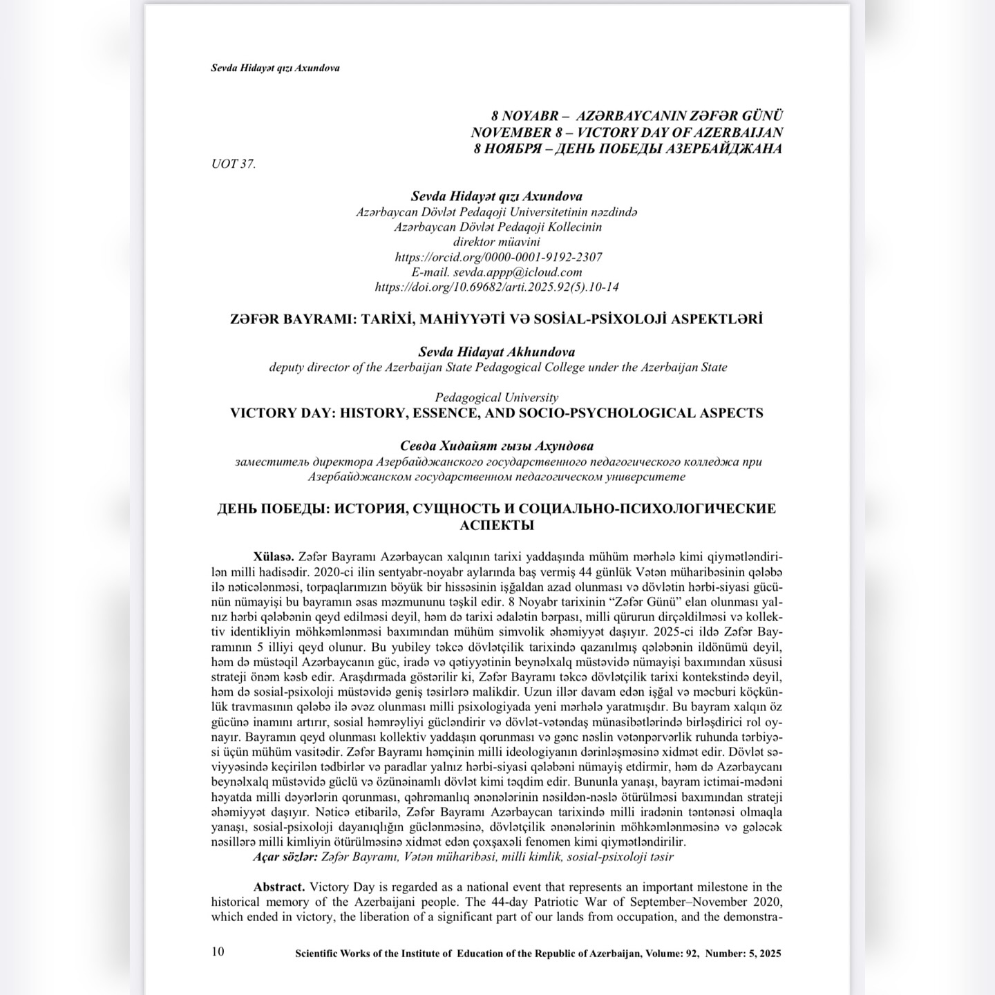 Azərbaycan Respublikası Təhsil İnstitutunun nəşri olan “Elmi əsərlər” jurnalının 2025-ci il, 5-ci sayında ADPU-nun nəzdində Azərbaycan Dövlət Pedaqoji Kollecinin Sosial və fəaliyyətlə məşğul olan direktoru Sevda Axundovanın “Zəfər bayramı: tarixi, mədəniyyəti və sosial-psixoloji aspektləri” adlı məqalələr dərc olunub.