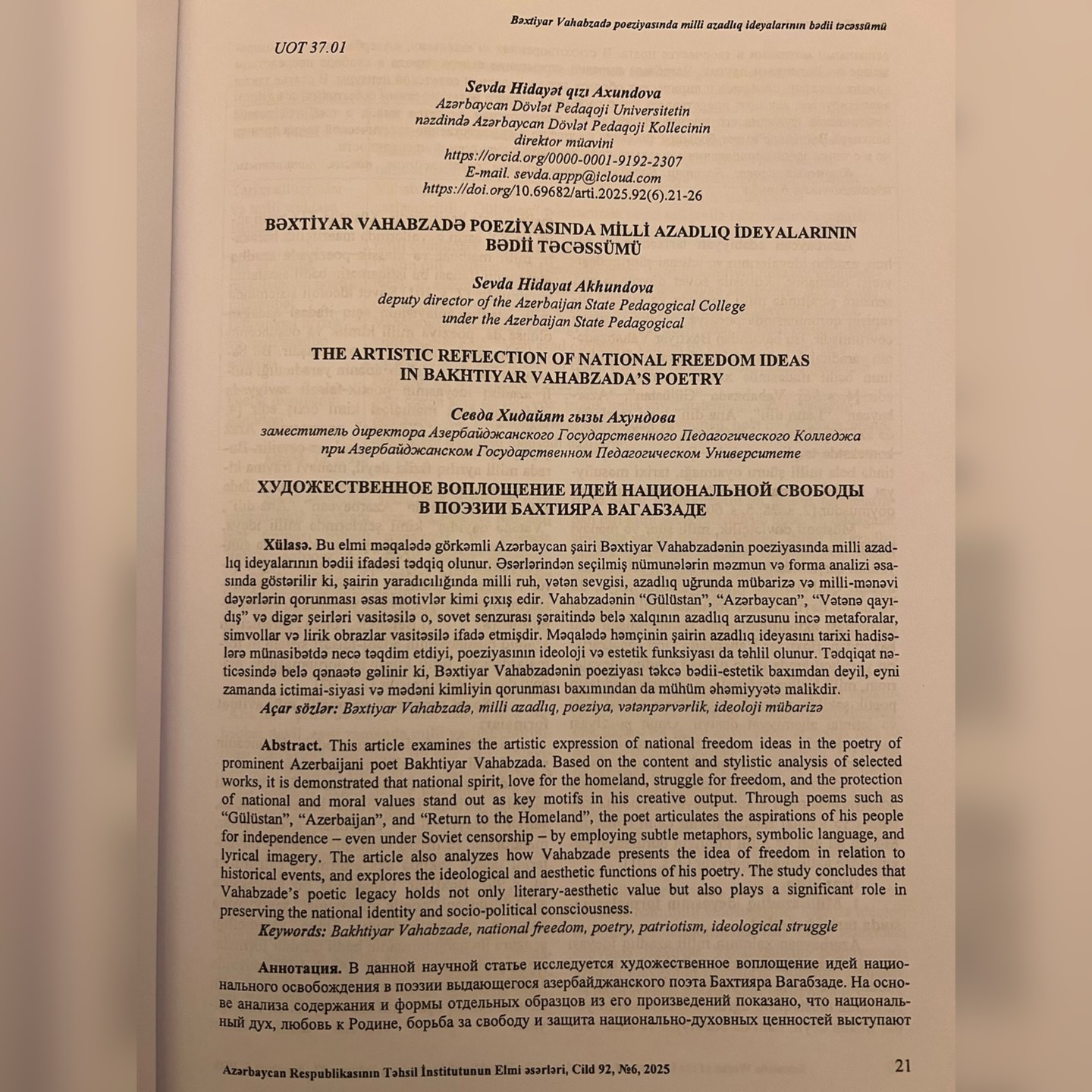Azərbaycan Respublikası Təhsil İnstitutunun nəşri olan "Elmi əsərlər" jurnalında ADPU-nun nəzdində Azərbaycan Dövlət Pedaqoji Kollecinin Sosial məsələlər və ictimaiyyətlə əlaqələr üzrə direktor müavini Sevda Axundovanın "Bəxtiyar Vahabzadə poeziyasında milli azadlıq ideyalarının bədii təcəssümü" adlı məqaləsi dərc olunub.