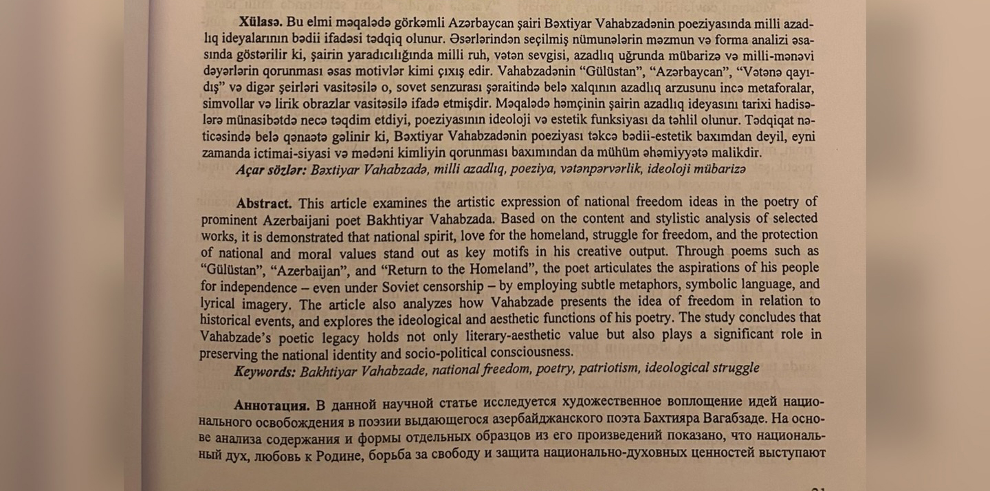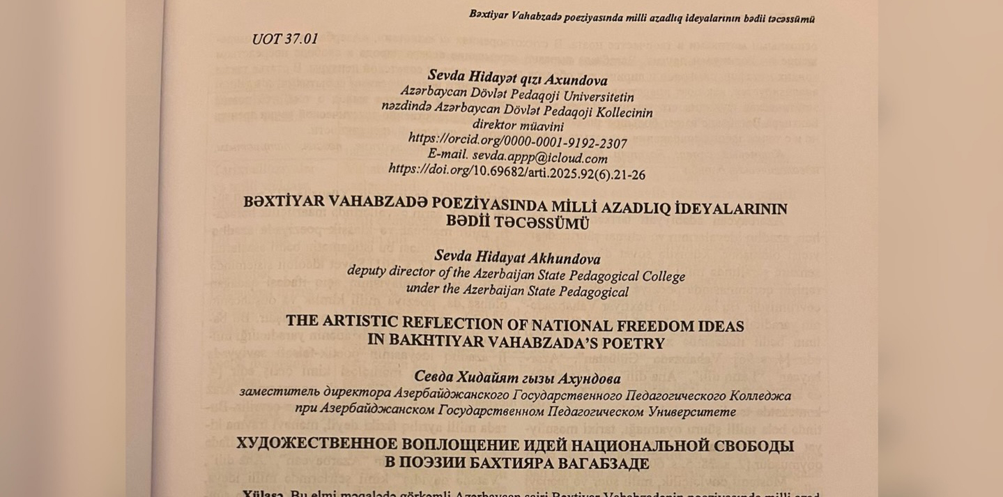 Azərbaycan Respublikası Təhsil İnstitutunun nəşri olan "Elmi əsərlər" jurnalında ADPU-nun nəzdində Azərbaycan Dövlət Pedaqoji Kollecinin Sosial və zərərlə mübarizə üzrə direktoru Sevda Axundovanın "Bəxtiyar Vahabzadə poeziyasında milli azadlıqlarının bədii təcəssümü" adlı məqalə dərc olunub.